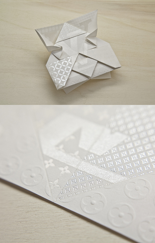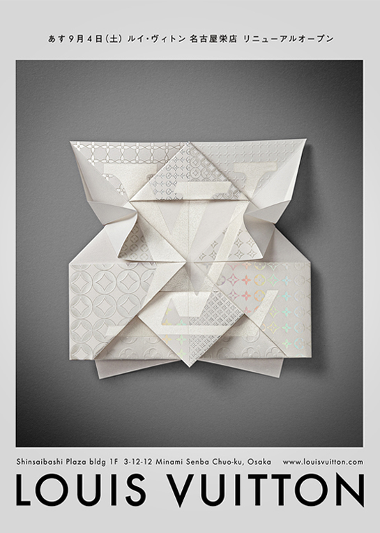 El estudio de diseño de Verona Happycentro es el creador de esta original pieza: una invitación para el evento de apertura de la nueva tienda de Louis Vuitton en Osaka. Los diseñadores de Happycentro explican el proyecto de esta manera: «La idea inicial fue un objeto de papel diseñado por nosotros; quisimos unir su forma, la expresión de precisión perpetua y pureza del mundo del origami y nuestra profunfa pasión por las técnicas de impresión»