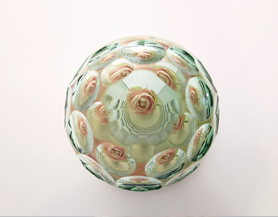 Designed by Bilge Nur Saltik, Op-Vase is a pedestal for a single rose but the glass shield causes a visual illusion, a kaleidoscopic effect, to create a magnificent bouquet. Each piece is hand crafted in Istanbul.