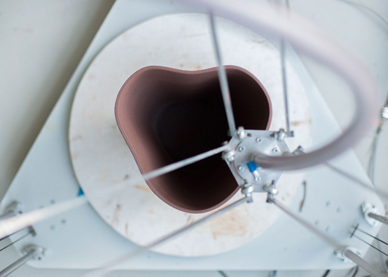 En los inicios de la impresión 3D existían muchas limitaciones. Por ejemplo, esta técnica no permitía producir objetos a escala humana. Pero, como Oliver explica «si se podían crear objetos que usamos habitualmente como pueden ser boles, platos y objetos decorativos pero con una baja resistencia al calor y no seguros para contener alimentos». Para resolver esta cuestión Oliver creó primero el material, un barro natural que puede estar en contacto con alimentos, y después diseñó una impresora 3D que, a modo de plotter, imprime objetos grandes y, lo más interesante, con detalles y texturas similares a las que se consiguen trabajando el barro con las manos de forma artesanal.
