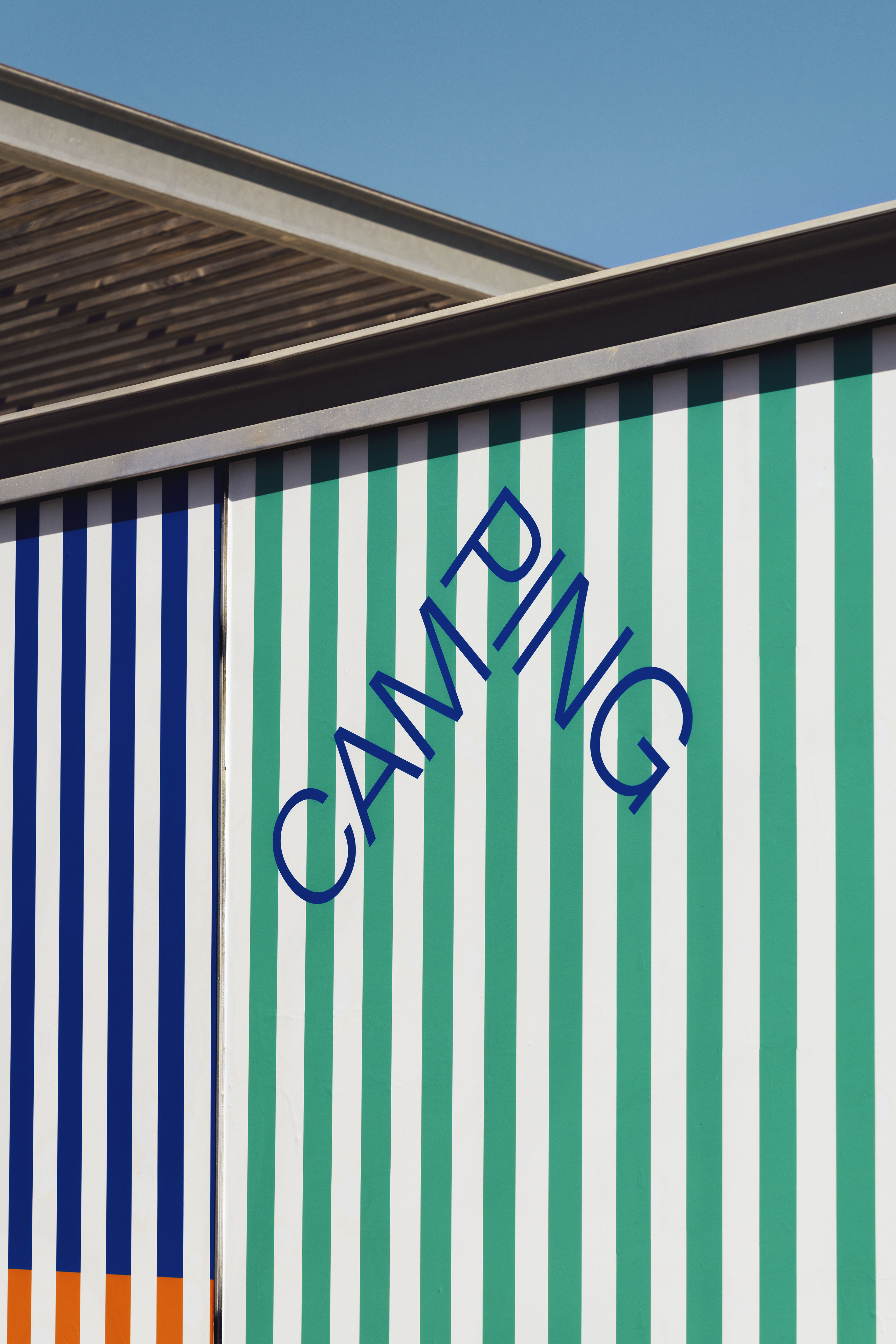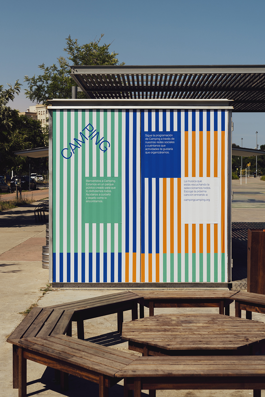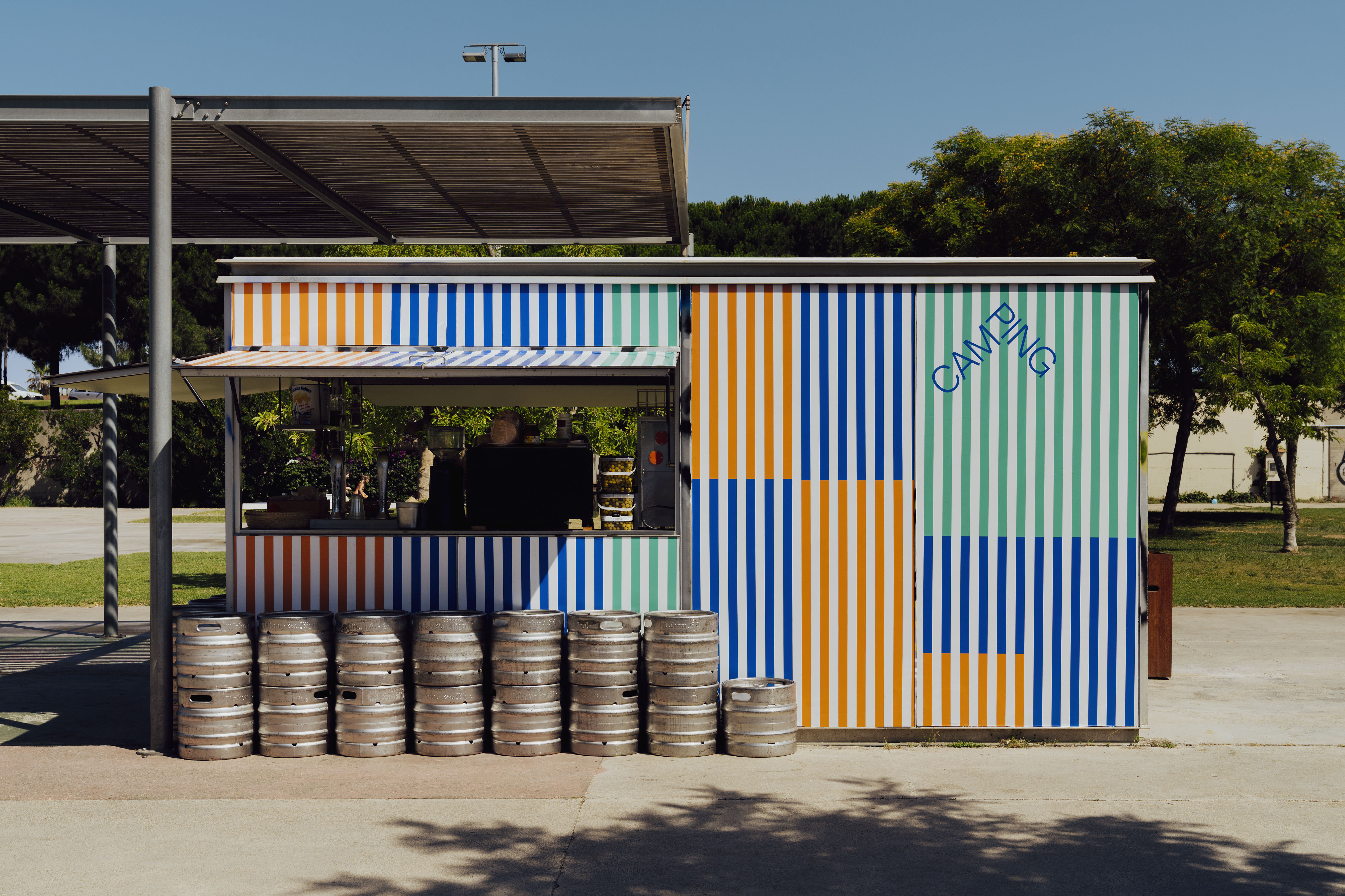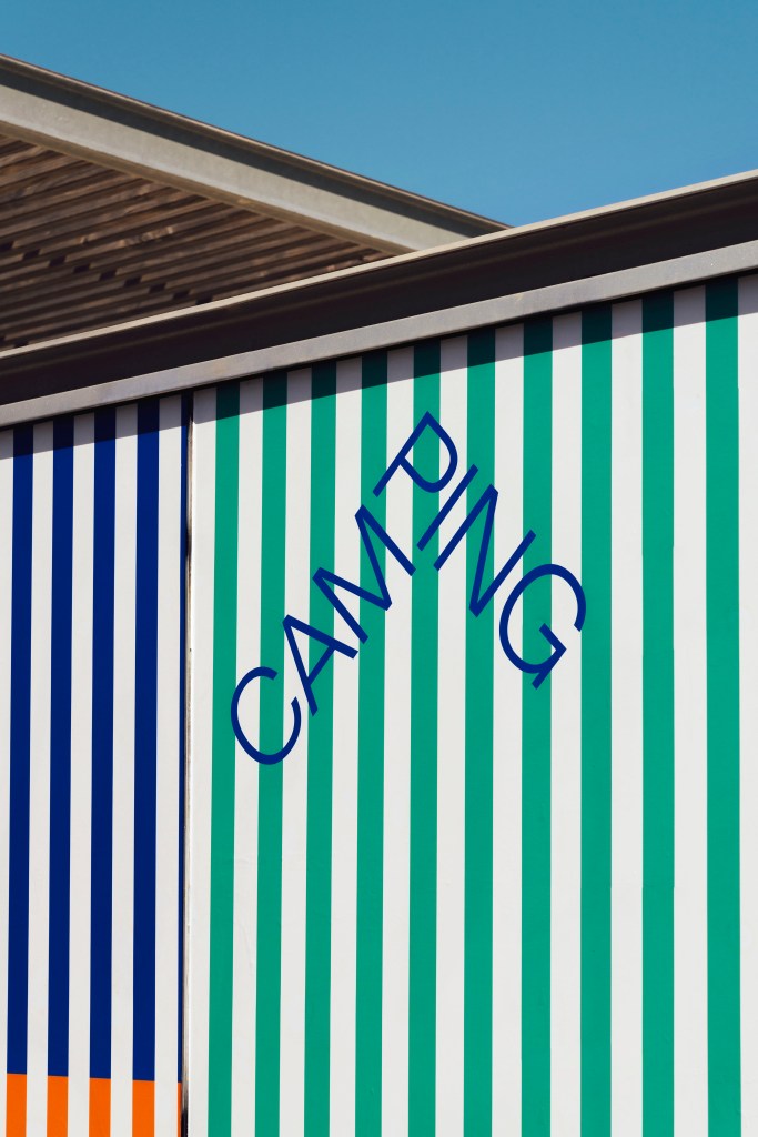 Camping es un chiringuito urbano diseñado para seducir los sentidos y cumplir los sueños de verano. La identidad se basa en las clásicas rayas azules y blancas mediterráneas pero con un toque refrescante. Fotografías de Enric Badrinas.
