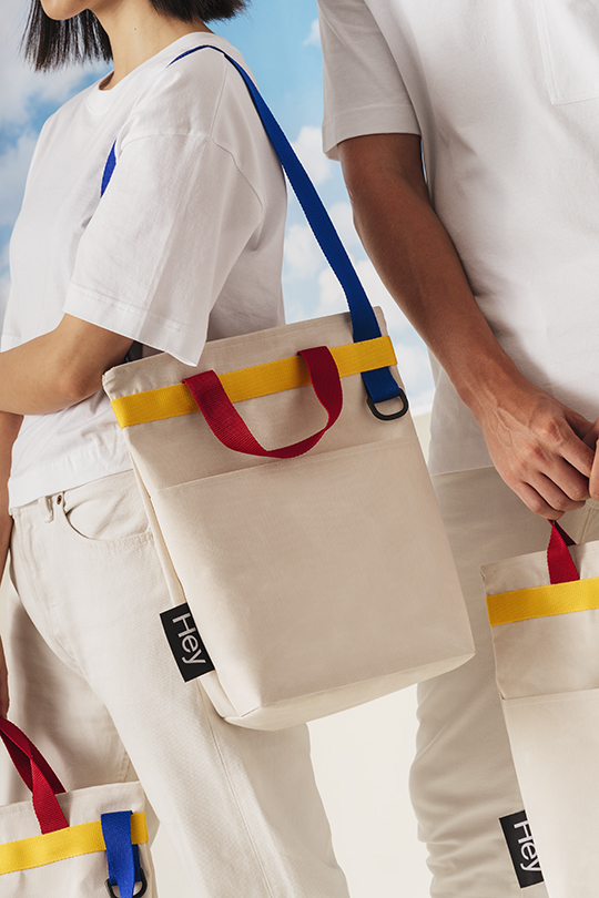 Disponible en HeyShop, HeyBag es una colaboración con la diseñadora de producto barcelonesa Júlia Esqué. Unas bolsas de tela para toldos, tejida localmente, impermeable y resistente a la luz solar. La producción es de Ared, que emplea a personas socialmente excluidas.