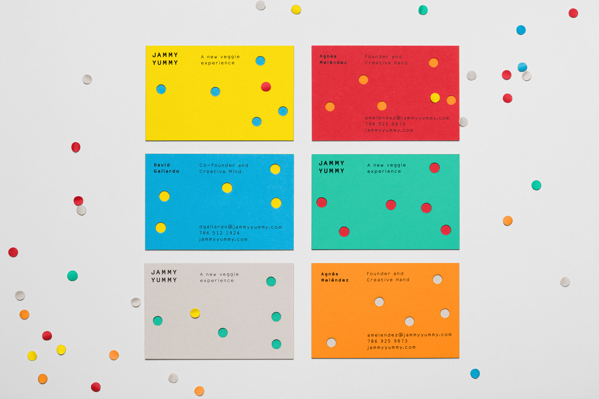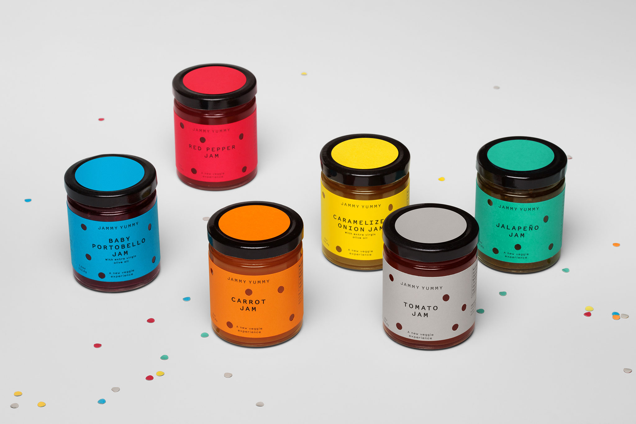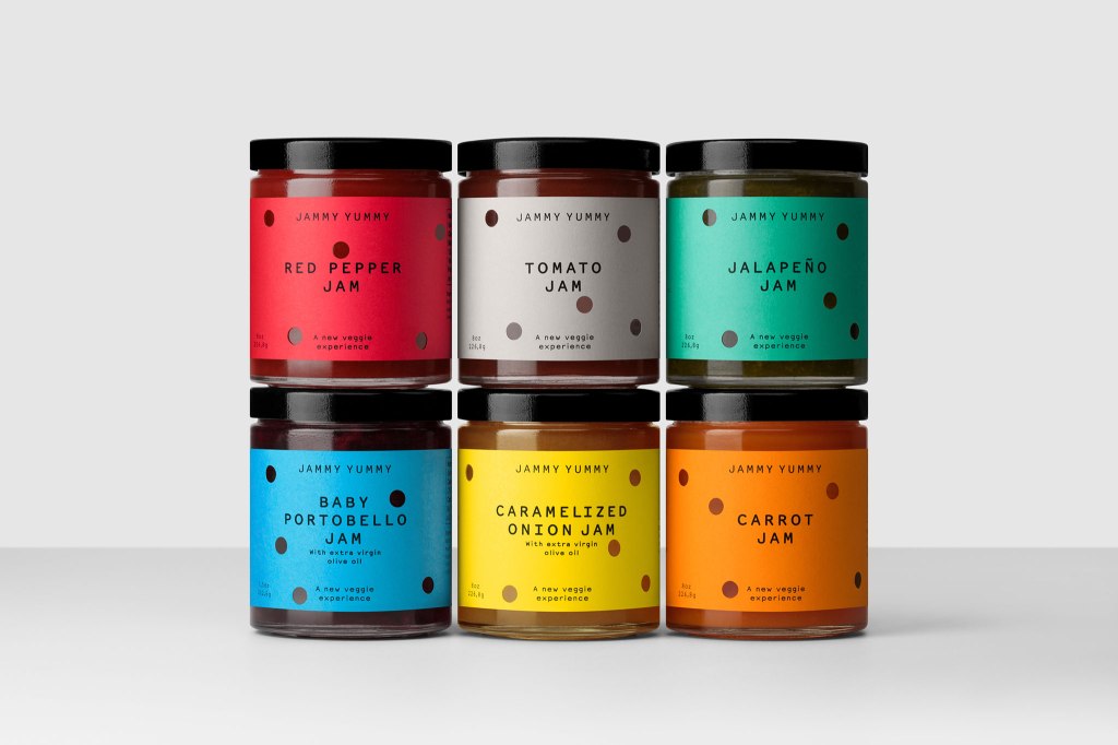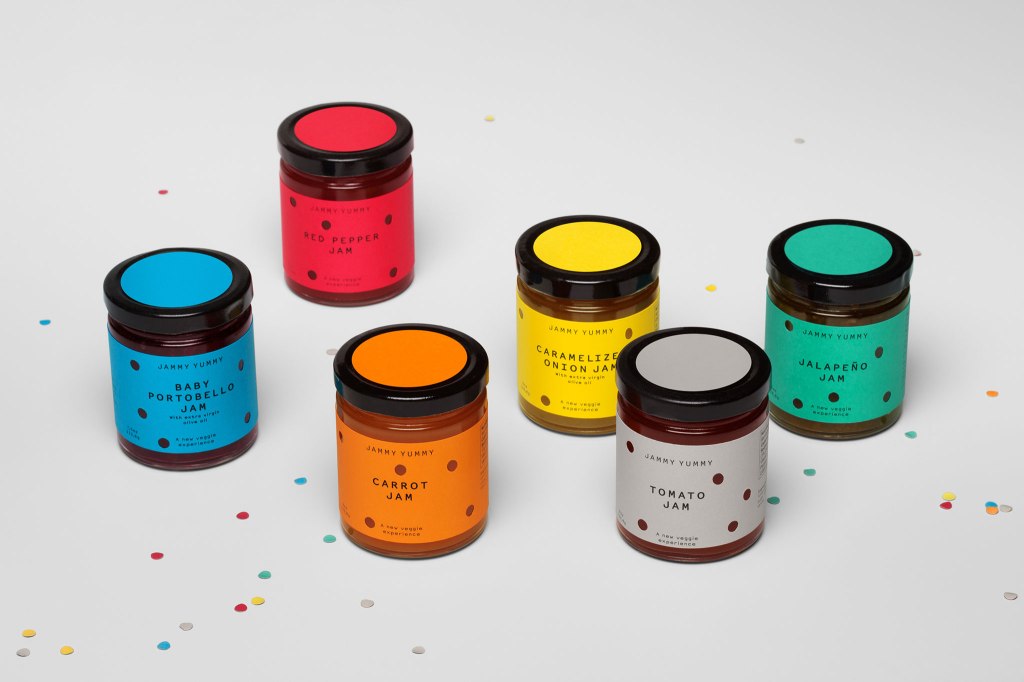 Con sede en Miami, Jammy Yummy tiene una gran variedad de sabrosas mermeladas de verduras hechas a mano, pensadas para bocadillos divertidos. Hey creó la identidad de marca y su packaging inspirándose en la idea de fiesta. Las etiquetas tienen perforaciones troqueladas al azar y los agujeros sugieren los mordiscos que con gusto damos a la comida deliciosa.