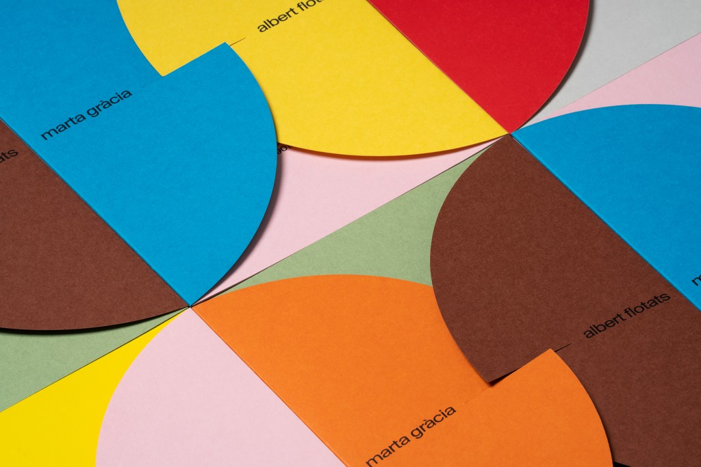 Diseño de invitación de boda con una representación gráfica y abstracta del matrimonio. Dos formas circulares que se unen y encajan perfectamente para celebrar la unión. El uso de papel de color fue esencial para desarrollar el concepto con un acabado impecable. Fotografías de Enric Badrinas.