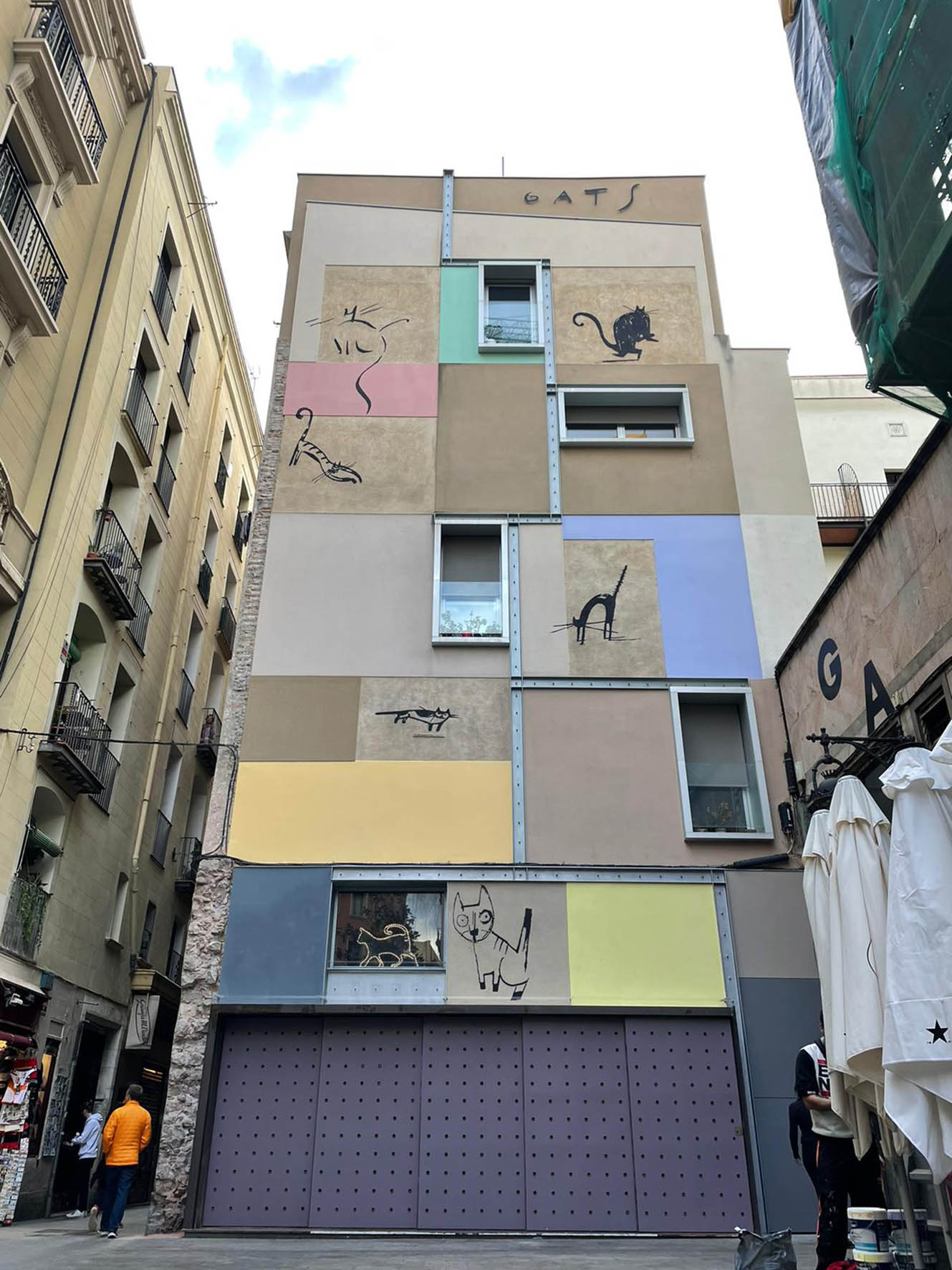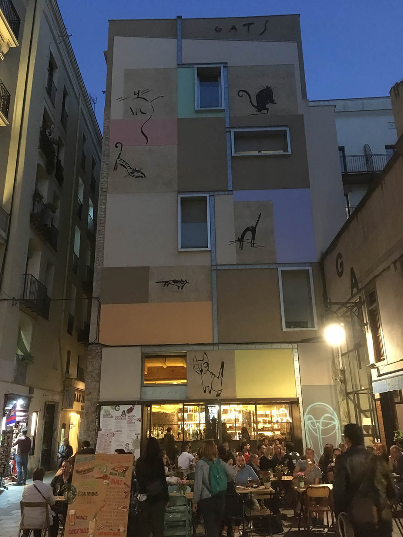 Mural en el barrio del Raval de Barcelona, un rincón que ahora es conocido popularmente como la «La Plaça dels Gats» (La Plaza de los Gatos). La acción formó parte del proyecto La Ciutat de les Paraules (La Ciudad de las Palabras), una iniciativa impulsada por un grupo vinculado al MACBA y apoyada por el Ayuntamiento de Barcelona. El muro, junto con los gatos, ha sido restaurado en dos ocasiones.